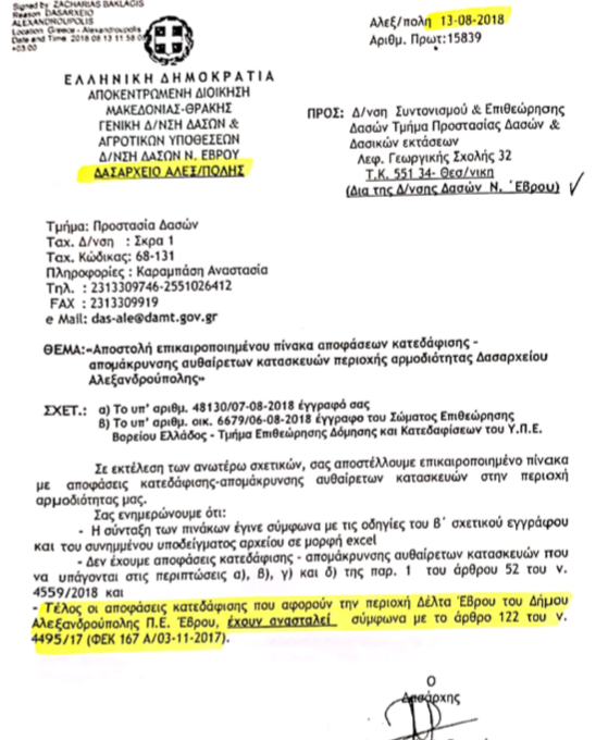 Σύμφωνα με απόφαση της 31/8/2018 του Δασαρχείου Αλεξανδρούπολης «Τέλος οι αποφάσεις κατεδάφισης που αφορούν την περιοχή Δέλτα Έβρου του Δήμου Αλεξανδρούπολης Π.Ε. Έβρου έχουν ανασταλεί σύμφωνα με το άρθρο 122 του ν. 4495/17 (ΦΕΚ 167 Α/03-11-2017)».