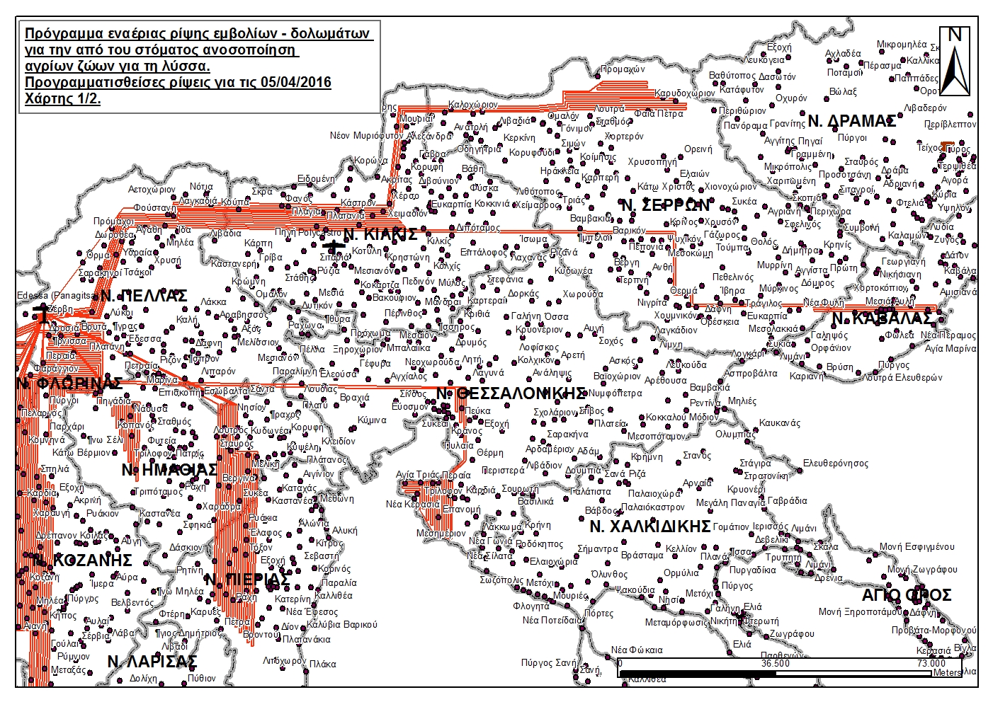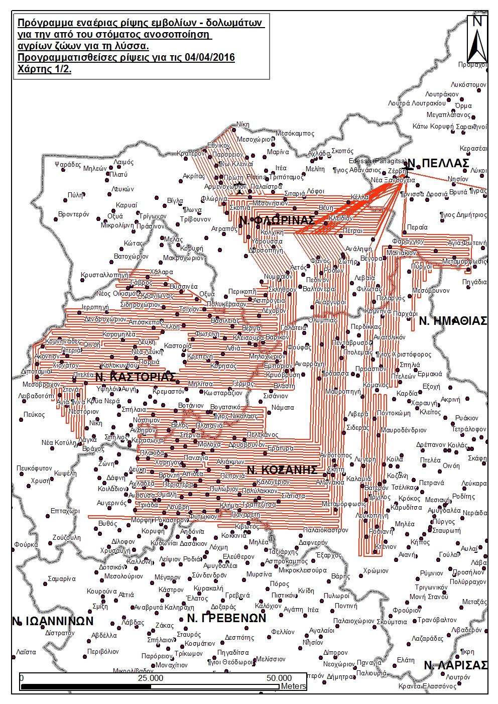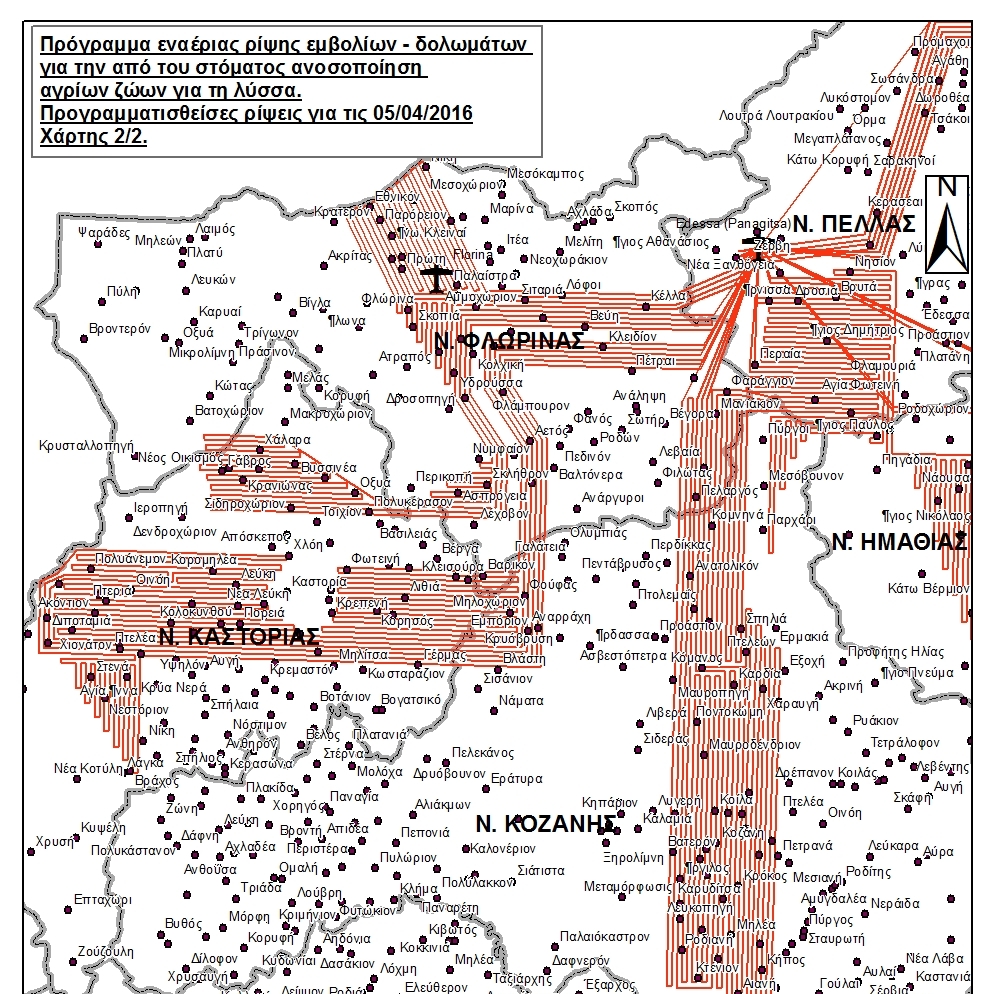 Σας ενημερώνουμε ότι στα πλαίσια της υλοποίησης του προγράμματος της ‘’εναέριας ρίψης - διανομής εμβολίων-δολωμάτων κατά της λύσσας, για την από του στόματος ανοσοποίηση των άγριων ζώων, για το έτος 2016’’ στις 05/04/2016, θα πραγματοποιηθούν ρίψεις εμβολίων – δολωμάτων στις κάτωθι περιοχές :