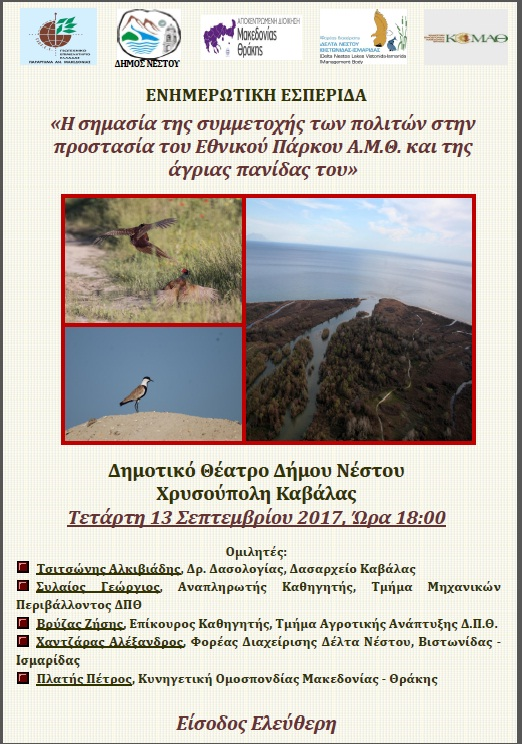 Tο ΓΕΩΤ.Ε.Ε. Ανατολικής Μακεδονίας μαζί με τον Δήμο Νέστου, την Δ/νση Δασών Καβάλας, τον Φορέα Διαχείρισης Δέλτα Νέστου Βιστωνίδας Ισμαρίδας και την Κυνηγετική Ομοσπονδία Μακεδονίας Θράκης, διοργανώνουν ενημερωτική εσπερίδα με θέμα «Η σημασία της συμμετοχής των πολιτών στην προστασία του Εθνικού Πάρκου Α.Μ.Θ. και της άγριας πανίδας του*».