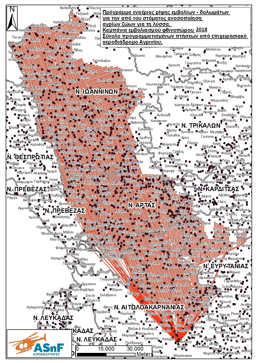 Σας ενημερώνουμε ότι στα πλαίσια της υλοποίησης του προγράμματος της "εναέριας ρίψης - διανομής εμβολίων-δολωμάτων κατά της λύσσας, για την από του στόματος ανοσοποίηση των άγριων ζώων" στις 24/04/2018 έως και 29/04/2018, θα πραγματοποιηθούν ρίψεις εμβολίων – δολωμάτων από το αεροδρόμιο του Αγρινίου στις κάτωθι περιοχές :